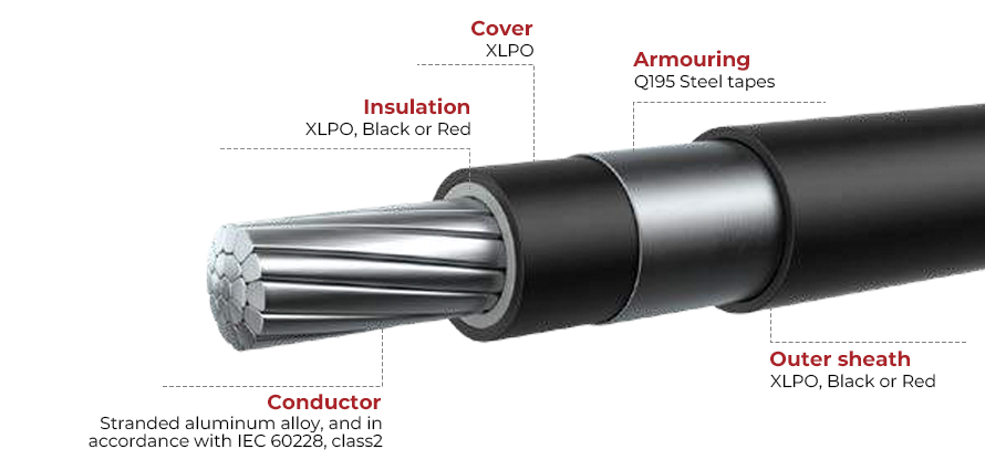 ハロゲンフリー。耐紫外線性の低圧ケーブルです。TÜV2642 アルミニウム ケーブルは、屋外用途や地面への直接埋設に特に適しています。