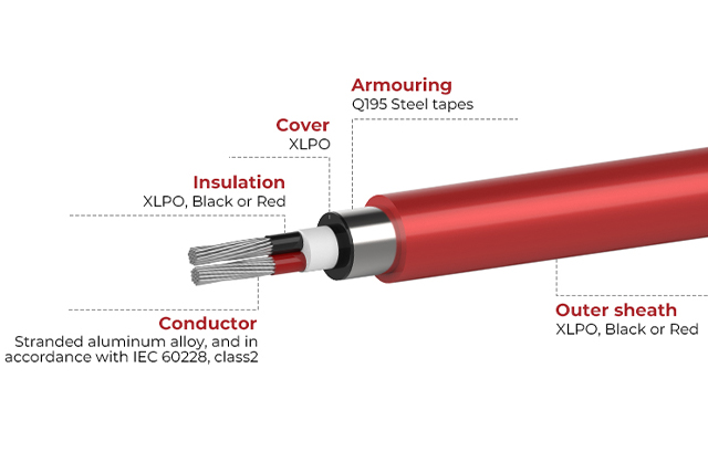 SUNKEAN 装甲ケーブルTÜV 2PfG/2642 1500V DC アルミニウム コア直接埋設ワイヤは、架橋ポリエチレン化合物 (XLPO) で絶縁および被覆されており、さまざまな過酷な屋外環境に適しています。これは直接埋設ケーブルのカテゴリーに属し、機械的損傷やげっ歯類の咬傷から保護するために外装することができ、同時に導管に被覆せずに使用することもできます。