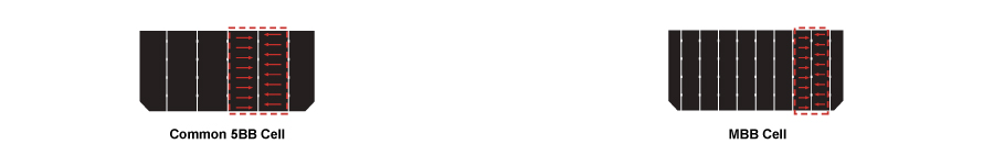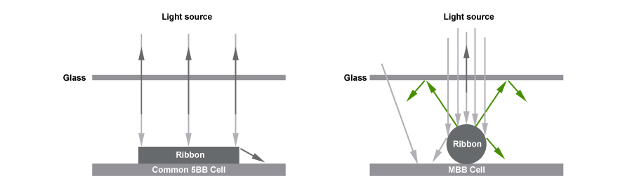 一般的な5BBモジュールとの比較,MBBモジュールは円形リボンを使用しており、シェーディング領域を減らし、入射光を繰り返し反射して発電を強化します.。