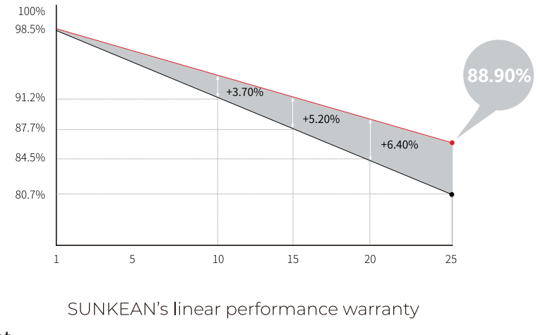 ヨーロッパの屋根用に設計されたSunkean のソーラー パネルは、以下に示すように、電位による減衰に対する優れた耐性を備えています。この能力により、このソーラーパネルの寿命は最低 25 年になります。