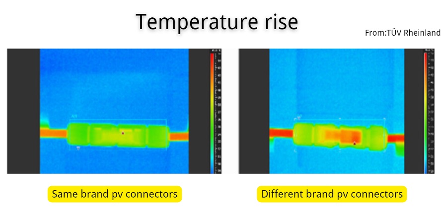 異なるブランドの PV コネクタの交差嵌合の結果: ケーブルの緩み。火災のリスクにつながる大幅な温度上昇。コネクタの変形により、気流と沿面距離が変化し、クリックの危険が生じます。