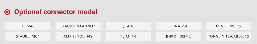 したがって、顧客にワンストップ購入を提供し、プラントの安全な運用、発電効率、および経済的利益を確保するために。SUNKEAN は、さまざまな主流のソーラー パネル ブランドのコネクタと一致する次のコネクタ ブランドを提供します。