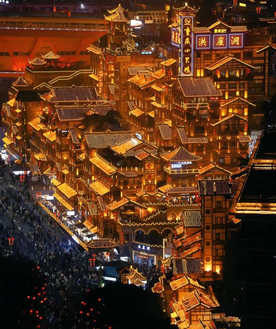 旅の最も印象的な瞬間の 1 つは、嘉陵江の川沿いに位置し、2300 年の歴史を持つ Hongyadong を訪れたことです。かつては八景の一つであり、丘の中腹と川沿いに建てられ、家の片側が岩の上にあり、残りの3側が木や竹の棒で支えられているのが特徴です。