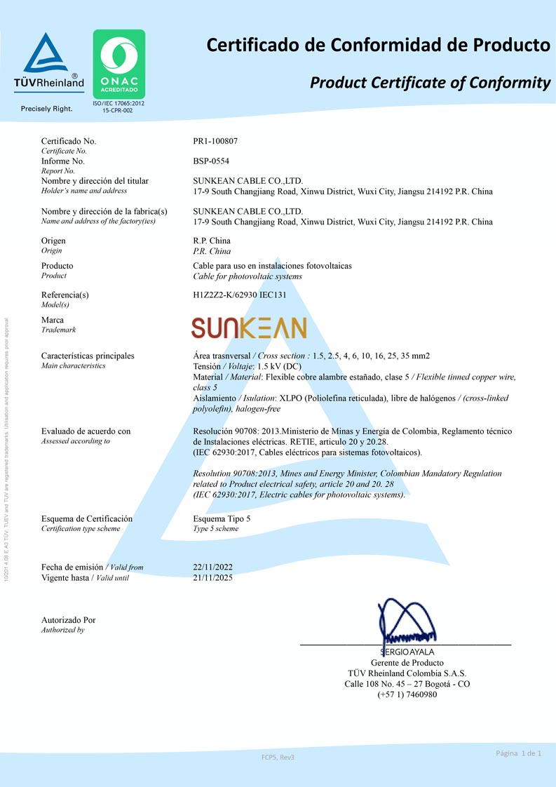 SUNKEAN は本日、同社のソーラー ケーブル タイプ H1Z2Z2-K/62930 IEC131 がコロンビアの RETIE 認証を取得したことを発表しました。この証明書には、1.5~35mm 2 H1Z2Z2-K/62930 IEC131 ソーラー ケーブルが含まれます。