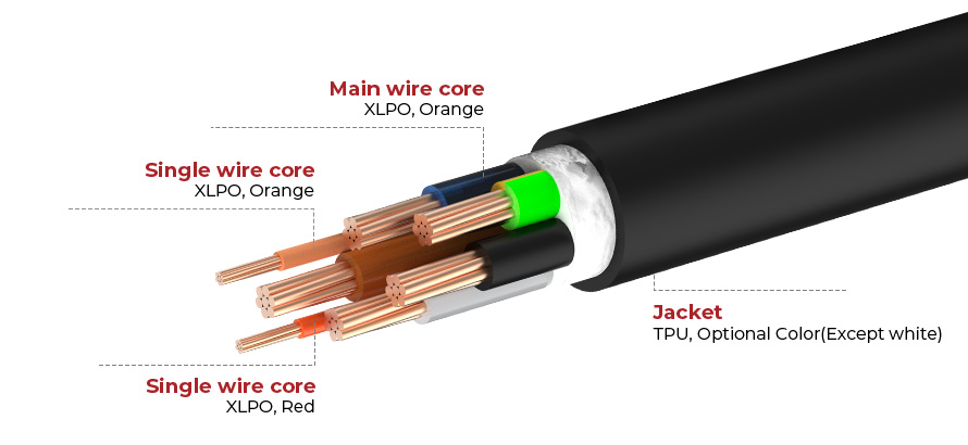 XLPO メインコア: 青、茶、黒、灰色、黄、緑 単線芯:オレンジ、赤 |