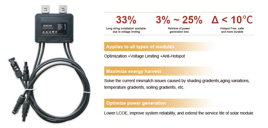 サンキーンのPVモジュール外部オプティマイザーは、アレイ内の各ソーラーパネルの背面に取り付けることができます.。太陽系の各パネルのパフォーマンスを最適化します,。太陽の向きに関係なく,シェード,または1つまたは複数のパネルへの損傷さえ.