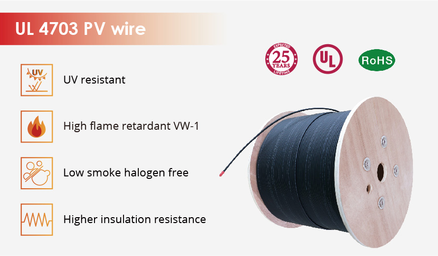 UL 4703 は裸銅導体と二層 XLPO 絶縁を特徴としており、最大 2000 ボルト、湿潤または乾燥温度 -40°C ~ +90°C のアプリケーションに対応しています。